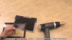 10. Now that the glue around the perimeter is warmed up, use a putty knife to separate the glass digitizer from the LCD screen. Begin with the left bottom edge, by placing the putty knife under the glass. Only insert the putty knife as far as the black border on the digitizer, so as not to cause damage to the LCD screen underneath. The glue should separate fairly easily, but if the putty knife is getting stuck or is difficult to move along the perimeter, apply more heat from the heat gun to further warm up the glue.